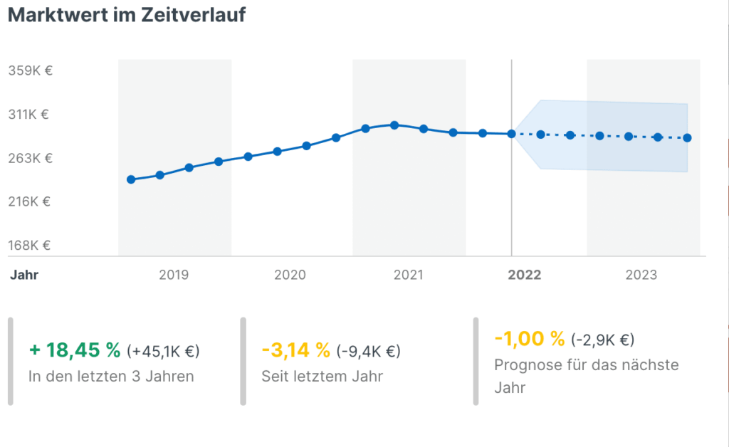 Es ist bereits zu beobachten, das unterstreichen wir gleich mit einem Chart, dass die Immobilienpreise beginnen zu sinken. Aufgrund dessen, dass die monatliche Belastung gestiegen ist, bleiben viele Interessenten aus und die Nachfrage ist nicht mehr ganz so hoch, wie noch im letzten Jahr. Dadurch sind die Käufer in einer stärkeren Position und können gegebenenfalls mehr verhandeln, wenn es keine weiteren Interessenten gibt. Seit letztem Jahr sind die Preise grob um 3 % gesunken. Das ist örtlich unterschiedlich, lässt sich aber auf den Großraum unserer Region Allgäu und Bodensee übertragen.